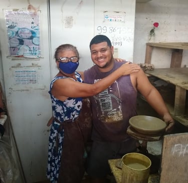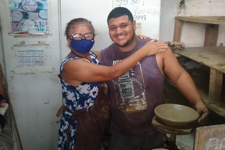 Meus filhos são outra história, o mais velho gosta nem de chegar perto. O pai dele eu separei porque não deu certo, meu ex-marido gostava de me maltratar, aí eu disse que não dava para continuar, então vim embora para cá. Cheguei aqui e como eu não estava trabalhando com nada ainda, uma prima me convidou para fazer panela de barro. Eu conheci o pai do meu outro filho, pois alguém de goiabeiras convidou ele para ser sócio em um galpão particular, pois não tinha esse aqui. Aí ele bateu o olho em mim, gostou e nos conhecemos através da panela de barro. Meu filho, Pedro Paulo, veio da panela de barro. Uma história de amor. Meu marido fala assim “já tive muitas mulheres brancas, loiras, de olhos azuis” e eu respondo “pois é, e parou numa neguinha”. Eu soube conquistar, por ele gostar muito de farra, de devaneios, seresta, ele saía e me deixava só, eu ficava quietinha em casa. A nossa conquista foi assim, ele falou “um amor livre sem cobrança, nunca morre, sempre floresce” e eu guardei isso dentro de mim, podia ser o que fosse, mas que o amor ia florescer, que um dia tudo aquilo ia passar e ele ia ficar só pra mim e hoje ele é só meu. E nessa história a gente está beirando os 30 anos. No galpão trabalha eu e meu filho Pedro Paulo, esse que veio do barro. Ele também gostava de mexer com peças de carro, pois meu marido tem uma loja disso, aí meu filho trabalhou numa oficina. Mas não estava dando certo, então eu falei para ele vir ao galpão, escolher barro, para ganhar um trocado para a família dele, assim ele veio. A minha visão que passei: eu peguei uma bola de barro, mostrei para ele e disse “meu filho, ta vendo essa bola de barro? Isso aqui é um ouro, se souber trabalhar com ela, você vai ganhar dinheiro”. E ele guardou aquilo, começou pisando no barro. Tive que me afastar 3 meses pra cuidar de uma pessoa, então ele ficou por conta, vi que estava fluindo bem e deixei ele trabalhar no meu box. Dessa maneira ele permaneceu e eu vinha só para dar uma força. Até que surgiu a pandemia e minha tia Lucilina, que trabalhava aqui, pediu para vender as panelas dela, logo também aproveitei para fazer umas panelinhas, até que ela não veio mais. Então os filhos dela não queriam que ela voltasse, e a associação quis decidir o que fazer com o box dela, todos queriam que fosse por sorteio porque como eu já tinha um box (o que meu filho usava), não queriam me dar. Mas minha tia veio aqui para falar com as responsáveis do galpão e disse que queria dar o lugar para mim, ela conversou e disse “eu não tenho filhas, eu tenho sobrinhas, e como minha sobrinha ta lá e ela não tem onde ficar, eu quero que dê o meu boxe pra ela.” E foi isso, tudo pela fé, porque a gente passa trancos e barrancos, pois ambiente de trabalho nem todo mundo ama todo mundo, mas enquanto me odeiam, eu quero passar meu amor, porque se eu passo meu amor, o Pai la em cima também vai olhar por mim.