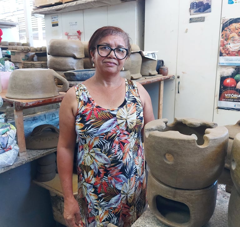 Meu nome é Tânia, eu tinha 8 anos de idade quando comecei a fazer panela de barro. Na verdade, a gente já nasce vendo, até que chega um certo ponto em que surge aquela curiosidade de mexer. Eu achava bonito as minhas tias e a minha avó fazendo as panelas. Nós somos descendentes, tendo a tradição desde tataravó, pois a tradição das panelas de barro veio dos índios que já mexiam com isso e meus tataravós faziam parte desse grupo. Então eu peguei a geração da minha avó por parte do meu pai. Desde pequena fazia panelinhas e a gente vendia. Daí em diante, eu permaneci nas panelas de barro, porém abandonei por um tempo para arranjar outro serviço, mas nunca abandonei de vez, sempre estive com a mão na massa. Passou um tempo, casei, fui embora para o Rio, voltei de novo. Então trabalhei como diarista, saí, voltei para o barro. Trabalhei 19 anos em uma locadora de carros, mas nesse tempo conheci um pessoal no aeroporto que queria fazer uma lojinha com panela de barro. Então eu trabalhava na locadora e fazendo essas panelas ao mesmo tempo. Aqui no galpão me chamavam de ligeirinho, pois eu era muito rápida no meu trabalho e era muita correria. Dessa forma, fiquei nisso até que dispensaram todos que trabalhavam na equipe de limpeza da locadora. Assim, resolvi que não queria trabalhar mais para seu ninguém, vou trabalhar nas minhas panelas de barro, pois é isso aqui que eu amo. Gosto de fazer panela de barro, gosto de conversar, muita das vezes tem um colega que precisa de uma ajuda, a gente vira psicóloga, faz tudo, até vendedora de Jequiti. Com a graça Deus eu consigo, pois tudo aqui na terra é distração, porque um dia a gente vai embora, então tem que aproveitar os momentos, fazer o que a gente gosta, poder ajudar o próximo. Eu amo meu trabalho, principalmente umas besteirinhas como esses vasos aqui, muita gente gosta de trabalhar na intenção da conquista de dinheiro, eu não sou muito disso não, gosto de conquistar aquilo que eu faço com amor, gosto de divulgar meu trabalho. É bom fazer aquilo que você vai em algum lugar e pensa “aquilo ali fui eu que fiz”, você fica orgulhosa do que faz, das pessoas terem gostado, é muito gostoso trabalhar com aquilo que você ama.